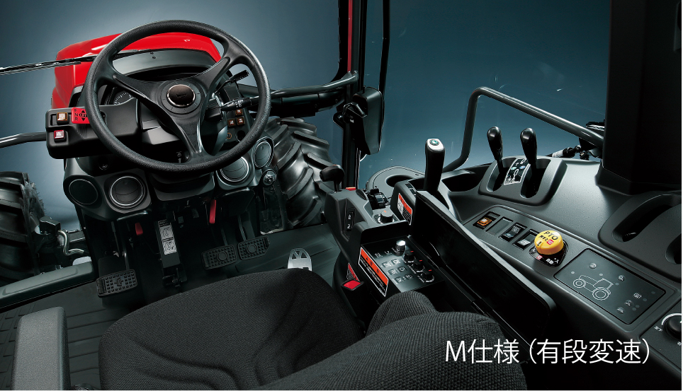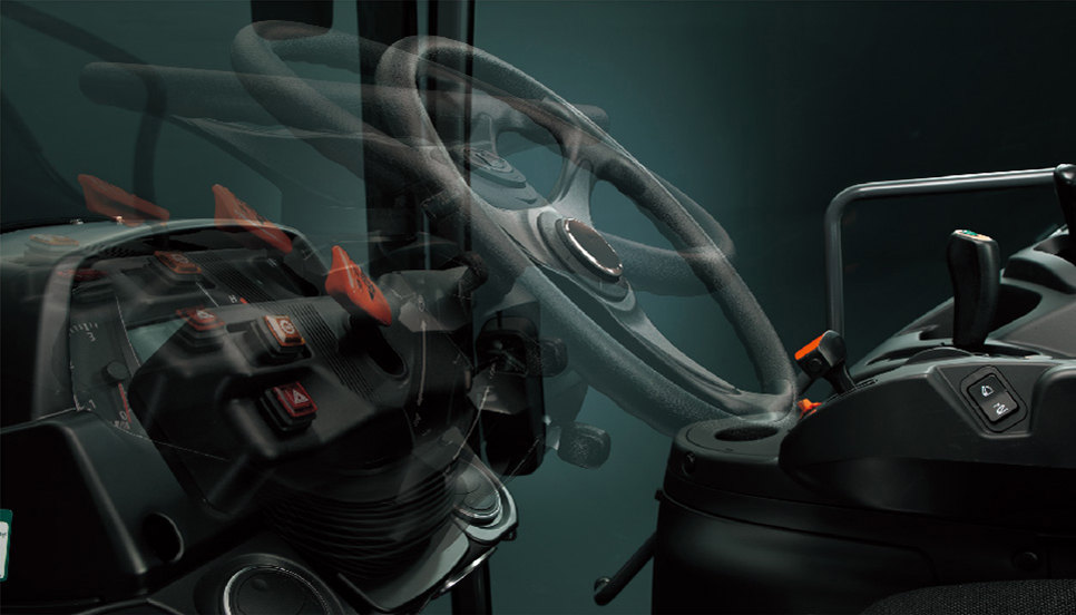 広い居住空間のキャビンは、視界も広く死角が少ない設計です。マフラ位置やリアフェンダ、ボンネット形状にこだわり、広い作業視界を確保しました。