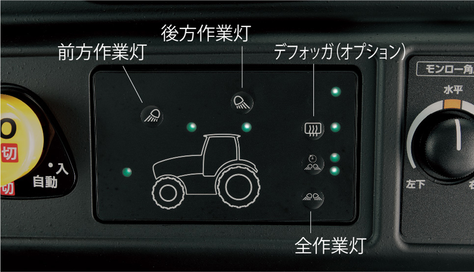 前後作業灯(オプションを含む)、デフォッガ(オプション)の「ON-OFF」をパネルスイッチに集約。一発で全灯・消灯も行えるので操作が楽にできます。