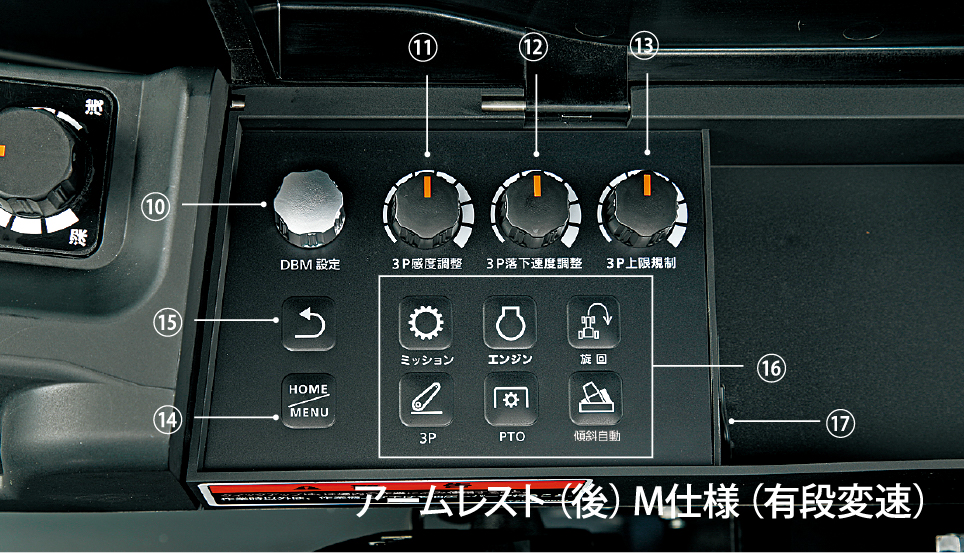 ⑳の3P内部操作スイッチ上昇側または下降側を押してる間、ロアーリンクは昇降し、スイッチを離すと耕深調整ダイヤルまたはポジションレバーで設定されている位置に復帰します。プラウやロータリの作業中、急に重負荷がかかった場合、3P内部操作スイッチ昇降側を押す事で、ロアーリンクを上昇させ、瞬時に負荷を逃がす事ができます。