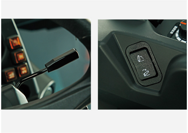 クイックアップスイッチハンドル手元にクイックアップレバー、右側アームレストにクイックアップスイッチを装備しているので作業機昇降が簡単にでき、作業中の旋回が効率的に行えます。