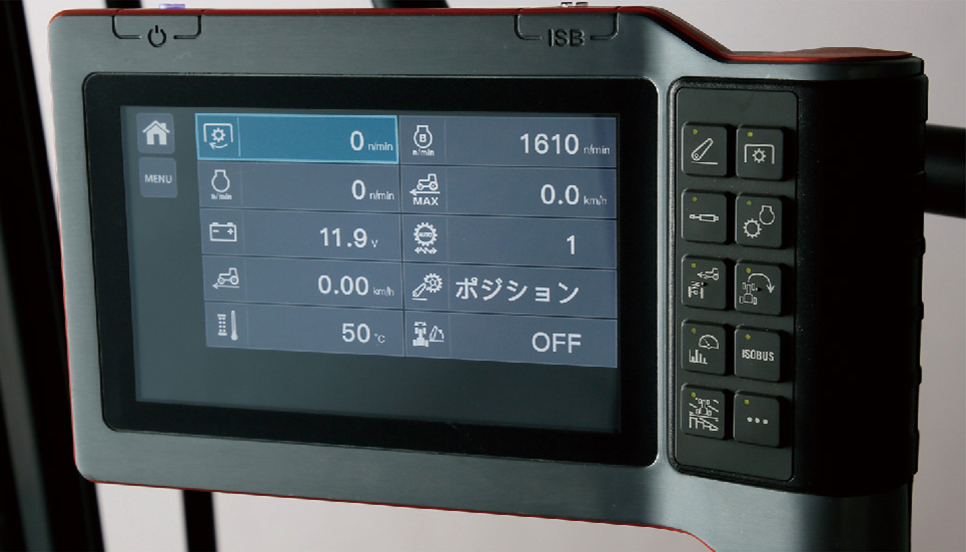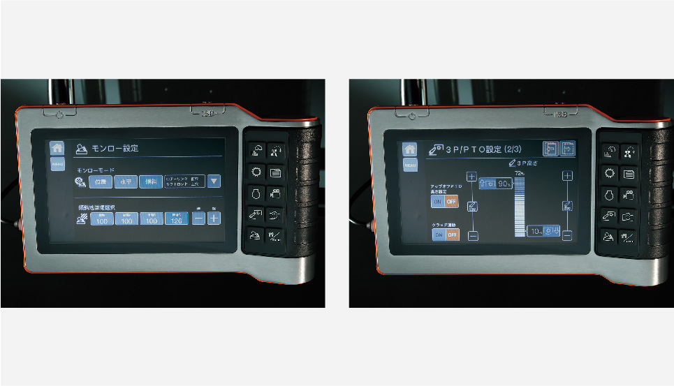 カメラモニタとしても使える7インチのカラー液晶サブモニタをオプションとして採用。トラクタの各種設定や機能のON/OFFが、画面を見ながら容易に行えます。