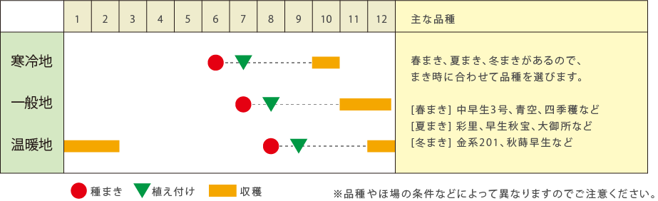 - 初心者には秋まきが育てやすくお勧めです。