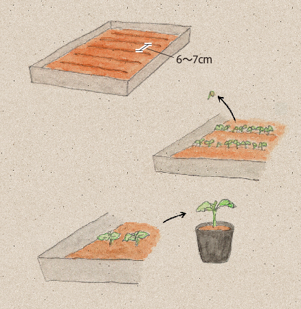 種まき1週間前に腐葉土を3~4割混ぜた土を育苗箱に入れ、苦土石灰ひとつまみを施します。種を6~7cm間隔ですじまきし、5mmほど土をかぶせ、十分に水をやります。湿らせた新聞紙をかけて直射日光を避け、乾燥を防ぎます。