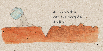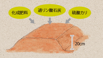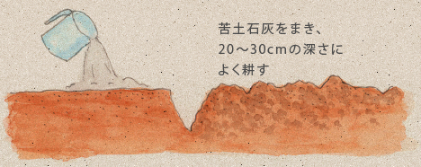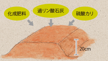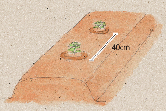 苗を植えつける3週間前に、1㎡当たり約80gの苦土石灰をまき、よく耕しておきます。その1週間後に、1㎡当たり化成肥料50g、過リン酸石灰50g、硫酸カリ30gを施し、もう一度耕してよく混ぜます。その後、うね幅60cm、高さ20cmのうねをつくります。
