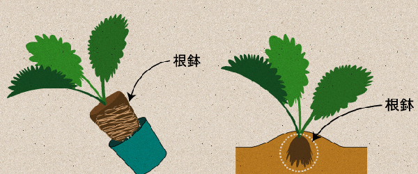 ポット苗を移植するときは、ポットをさかさまにして苗を手で受けとめると株を傷めずに簡単に外せます。
