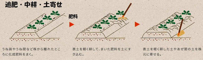 よく耕してやわらかくした土も、雨などの影響で次第に固くなってきます。そこで、根を傷めないように気をつけながら、クワなどでときどき表土を軽くかくように耕し、土をほぐして空気を含ませます。