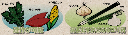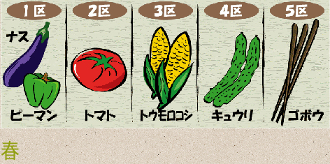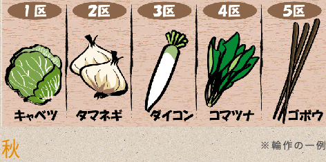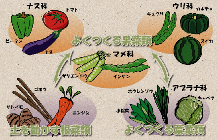 ※連作障害 毎年同じ場所に同じ野菜をつくると病原菌が増殖したり、土中の成分が偏って年々生育がわるくなってきます。