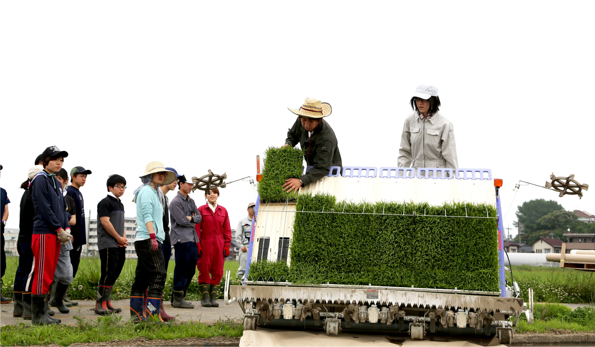 無農薬で作る安全でおいしいお米づくり、これにはすごい勢いで増える雑草を処理する除草作業がつきもの。負担の大きいこの作業を少しでもラクに行える様にとの思いから大学の研究はスタートしました。そんな中「光を遮ると雑草は生育しない!」という事を発見し光を遮る様々なテストを実施。試行錯誤を重ねる中、ある学生の「新聞紙はどうだろう?」というアイデアから〝再生紙マルチ水稲移植栽培法″が生まれました。この移植技術を我々と大学の共同開発で機械化したのが再生紙マルチ田植機です。そして今回、今も進化を続ける最新の紙マルチ田植機LKE60Dが大学の記念事業のサポートとして鳥取大学に里帰りします。