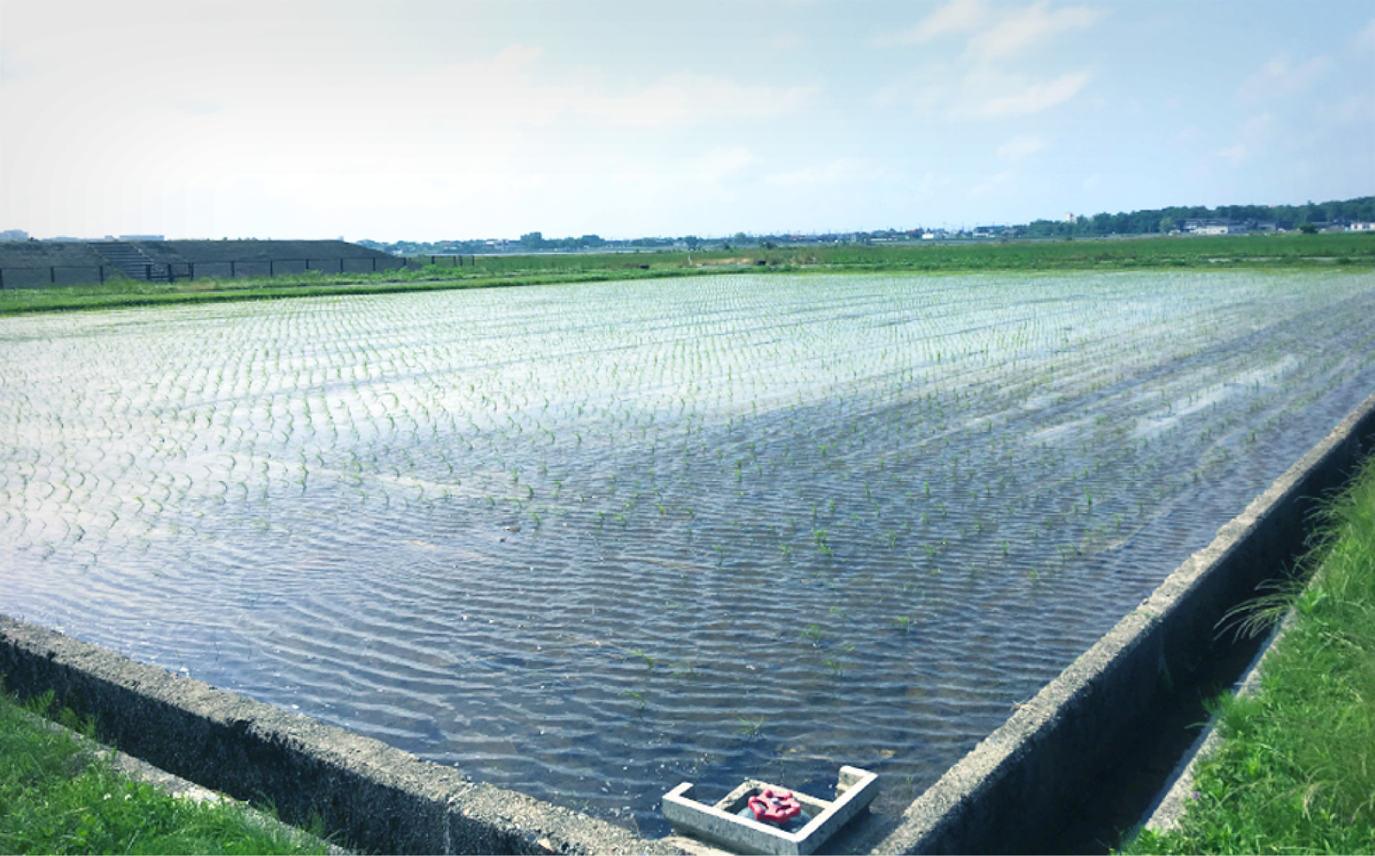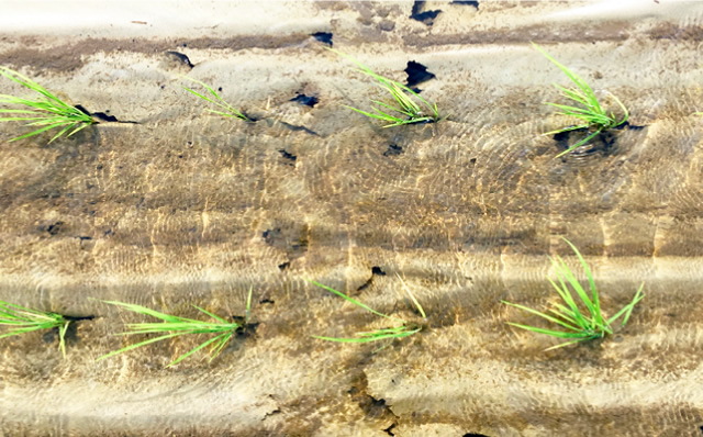 しっかりと中干しができたら、再び湛水管理を行います。最初は走水といって水を入れるのですが、すぐに全部抜いてしまいます。一気に水をやると根腐れを起こすこともあるので、走水を入れてすぐ抜いて、次の日また入れて、抜いてという作業を行います。2回走水をしてから、中干し前の湛水管理に戻します。
