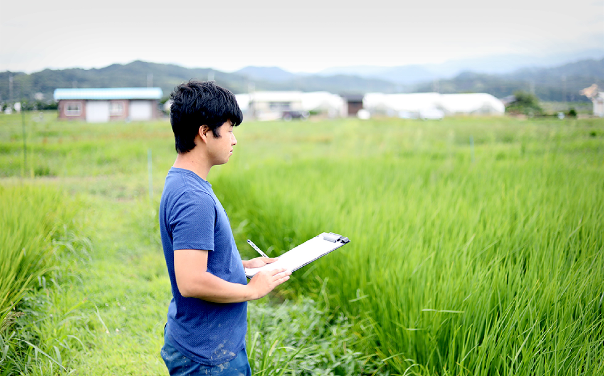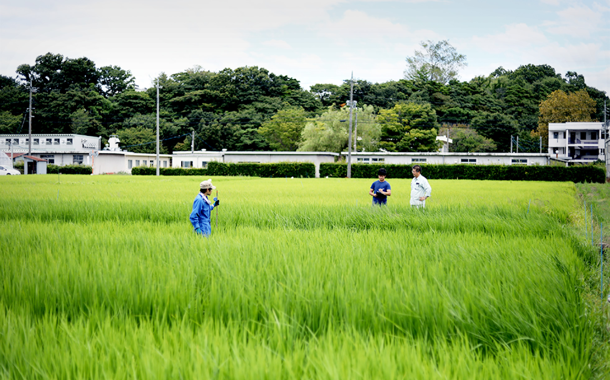 近くの圃場でも学生さんが研究のための作業を行っていました。大学には今回の企画に使っている他にも多くのほ場があり ます。6ブロックに肥料パターンを分けたほ場で、2週間おきに草丈や葉の枚数、葉色などを測定。1週間おきに定点写真も撮影しているそうです。窒素量を変化させ倒れない大きさで、最も多く収穫できる生育方法を研究中。この日はデータ採集の一環で草丈と葉の枚数の測定を丸一日かけて調査していました。