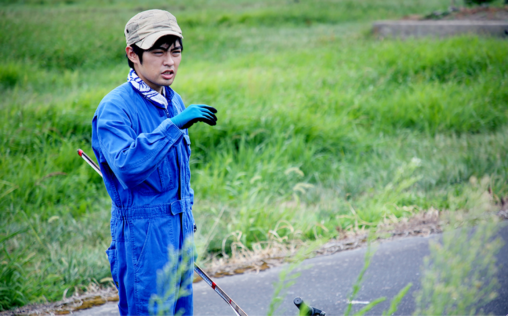 畦に雑草が生えていると雑草の種が田んぼに落ちたり、根が伸びたりして田んぼの中まで雑草が生えてくるので、大きくなる前に除草作業を行います。今回の強力のように農薬も使用しない場合は、特に病気もつきやすい ので、それを防ぐために除草して風通しをよくすることが重要です。また、カメムシの被害を抑えるためにも除草は重要な作業です。稲に穂が出るとカメムシが寄ってきます。基本的に雑草の方が稲より早く穂が出るので、始めに雑草にカメムシがつきますが、雑草についているとそのまま稲に移りやすくなります。そのため、本来はずっと雑草がないのが理想ですが、特に出穂期には雑草を短くしておく必要があります。