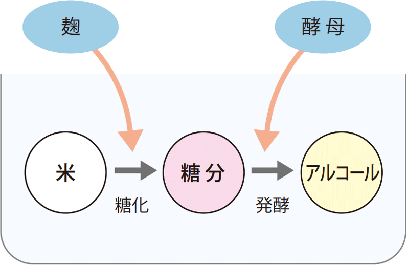 日本酒を造る際は図のように、お米のでんぷんの糖化には麹、