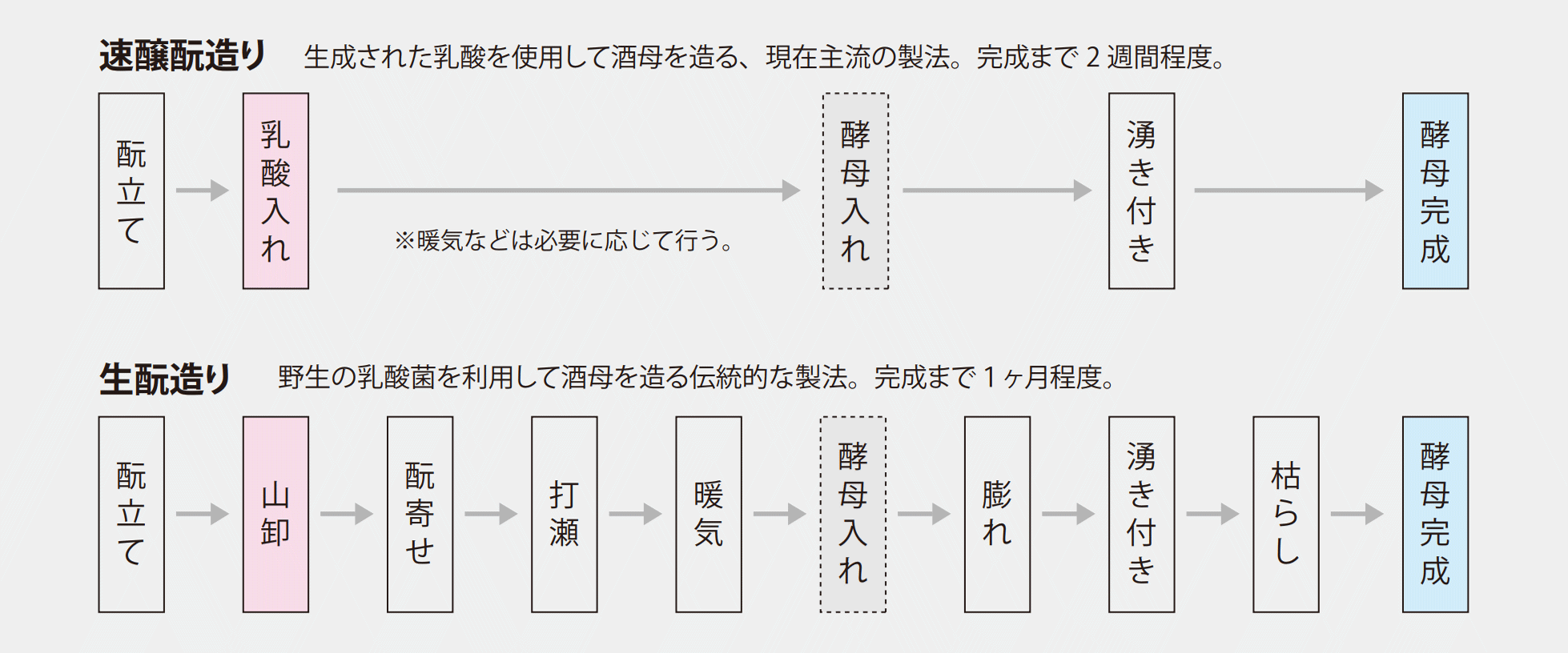 このとき酒母の造り方には大きく分けて2つの製法があります。ひとつは生成された乳酸を人工的に添加する「速醸酛造り」という現代のお酒造りでは一般的な製法、もうひとつは自然界に存在する乳酸菌を利用する「生酛造り」という昔ながらの製法です。生酛造りは厳しい温度管理や手間・時間がかかるため、明治頃から減ってしまった製法ですが、醸造過程に多くの菌が関わり、自然の摂理によって選別された強い酵母菌によって発酵が行われるため、立体感や奥行きのある味わい深いお酒ができると言われています。