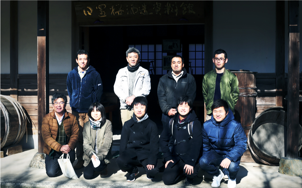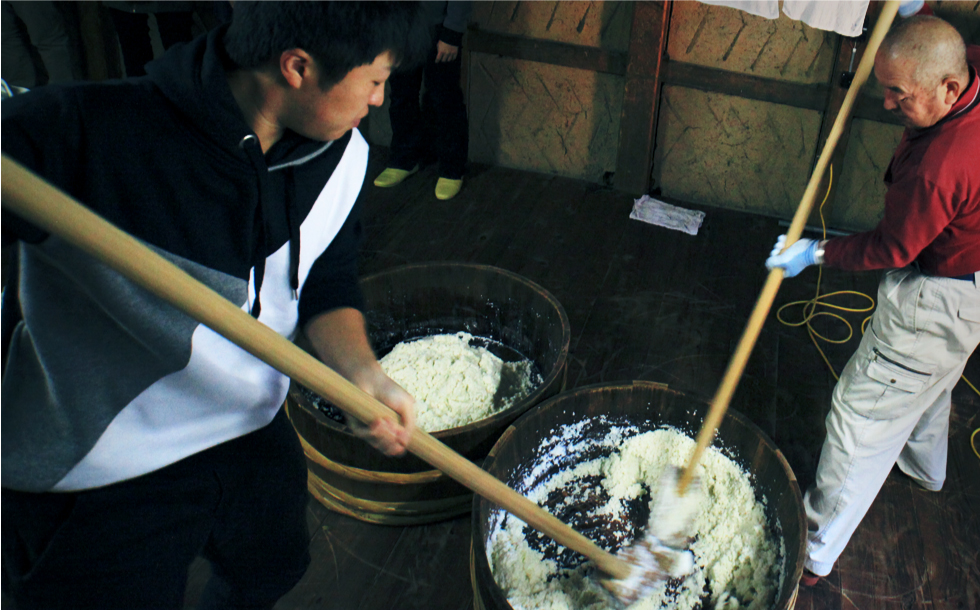 学生さんたちが育てたお米による70周年記念酒づくりはここからお酒造りのプロの手に。地元のチカラを合わせたお酒づくりは着々と進行しています。今回は昔ながらの「生酛造り(きもとづくり)」という製法でお酒を造るという事で、その中の一工程である「山卸(やまおろし)」を体験するため、学生さんたちは醸造を行う山根酒造場を訪れました。
