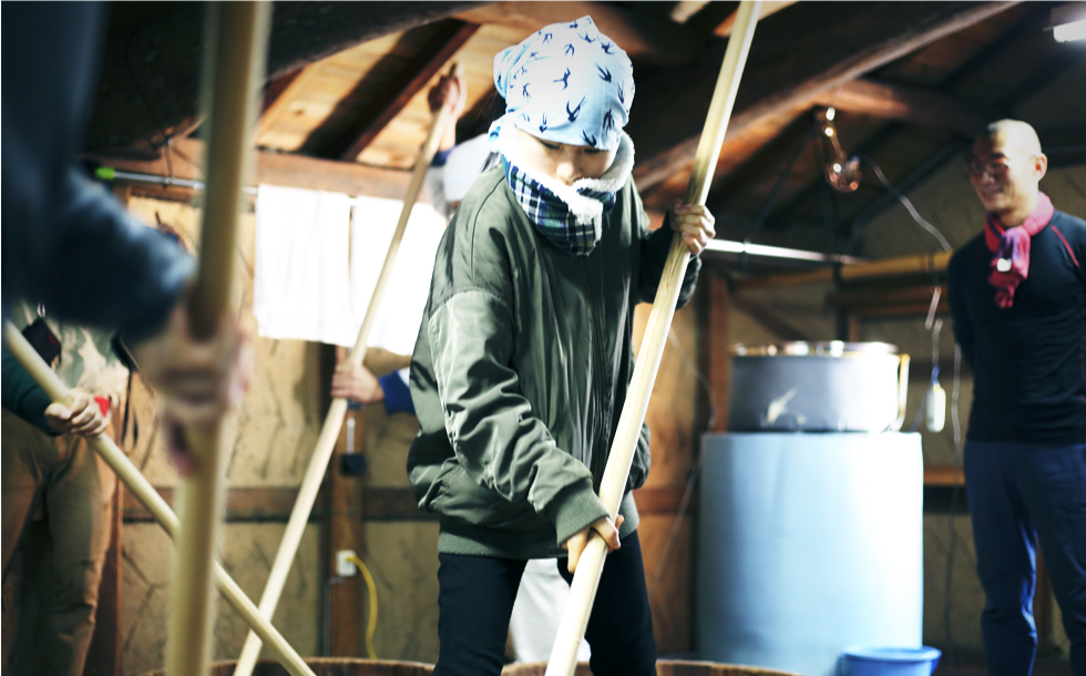 山根社長から今回のお酒造りの概要や体験の内容を伺い、酒造場見学を行った後は、いよいよメインイベントの山卸体験。作業には蒸米を入れる「半切り桶(おけ)」とお米を擂り潰す「櫂(かい)」という道具を使います。山卸の作業は一つの桶に対して2人がペアになって行います。向き合った状態でお互いの櫂がぶつからないよう、左右交互にお米を擂り潰しては引き、引いては潰すというように作業していきます。これを職人さんの合図でスタートし、2分間ずつ作業者を交代しながら、数回に分けてお米を擂り潰します。