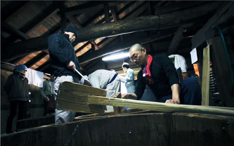 今回学生さんが行ったのは、形が残った状態のお米を潰していく「一番櫂(いちばんがい)」といわれる作業で、山卸の作業の中で一番力がいる作業です。学生さたちは櫂が重くて思うようにお米が潰れず、苦戦しているようでしたが、職人さんたちによると「今日は量も少ないし、まだ全然楽な方だよ」とのこと。山卸ではこの作業を「一番櫂」、「二番櫂」、「三番櫂」と時間をおいて3回行い、お米を擂り潰しながら徐々に蔵の乳酸菌を入れ込んでいくそうです。体験と同時にプロの仕事を間近に感じることもでき、普段経験することのできない貴重な体験となりました。手を加えた分、お酒の出来上がりがますます楽しみです。