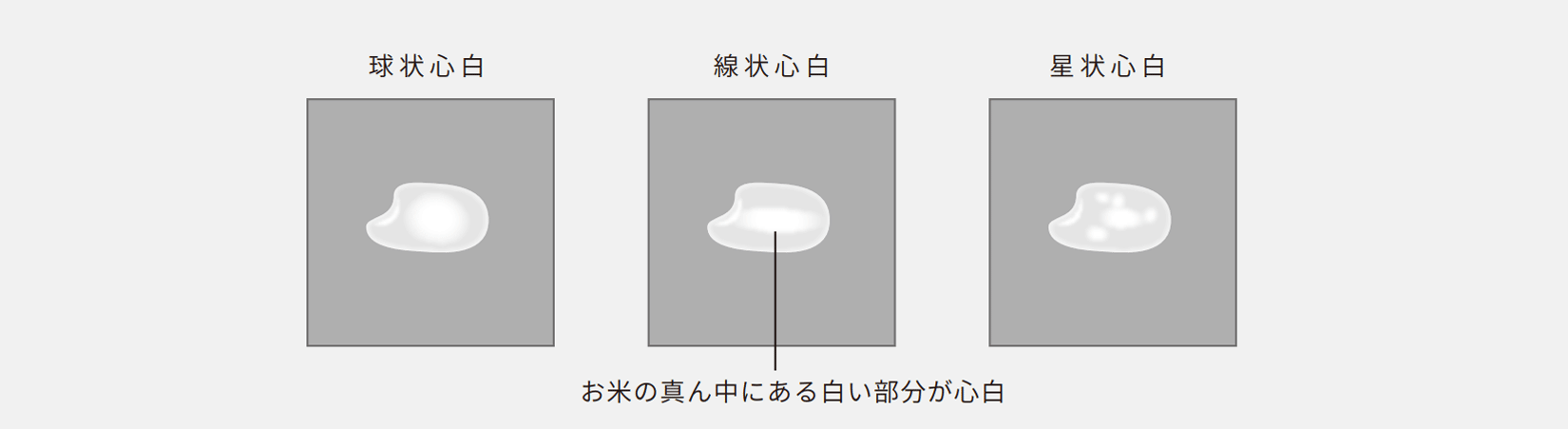 お米には中心に白く不透明な部分があり、これを「心白(しんぱく)」と呼びます。心白は細かく空気が入った状態のため白く見えます。心白の中は麹菌が繁殖しやすいため、お酒造りにはこの空気の隙間が大切で、心白の部分が大きいお米がお酒造りには適しています。心白の形にも種類があり、白い部分が丸い「球状心白」、細く点が散っている「星状心白」、そしてお酒に一番適した細長い「線状心白」などがあります。「線状心白」はこれらの中でも心白を残しながら削れる部分が一番多いため、大吟醸などのお酒にも適しています。