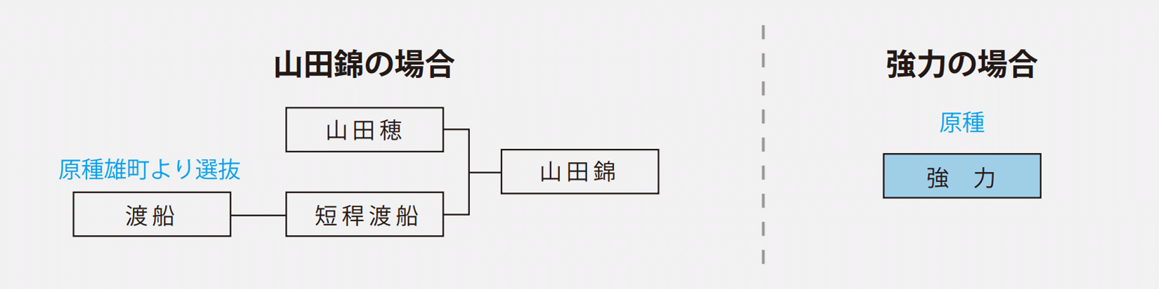 酒米は品種改良によって生まれたものと、突然変異によって生まれた原種と呼ばれるものと大きく2種類に分類できます。品種改良によって生まれた多くの酒米は、2つのお米を掛け合わせて作るので、両親となったお米の特徴が少しずつ残って感じられます。一方で「強力」を始めとする原種は突然生まれた酒米であるため、どのお米とも違う独特で個性的な味がするそうです。